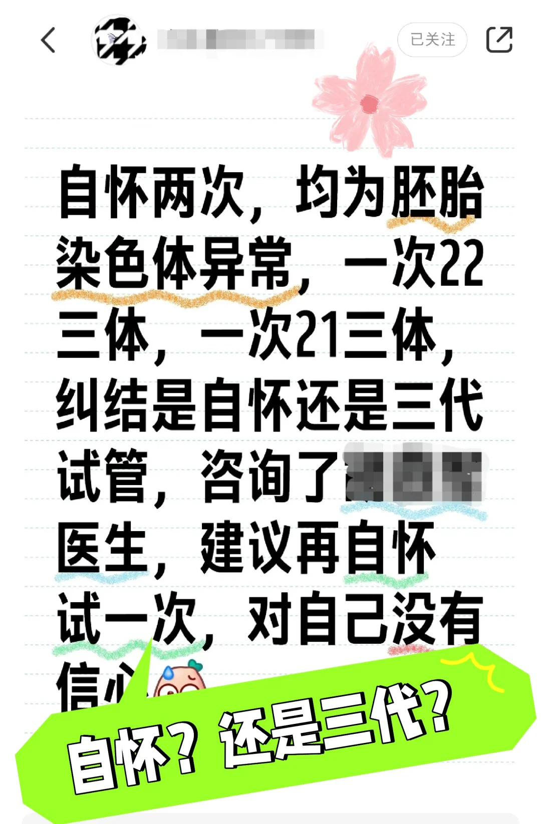 么办?自怀?还是三代?纠结中。我个人建议可以考虑做三代试管婴儿了,原因有二,一是已经两次胚胎停育,而且都是胚胎染色体异常,第三次出现染色体异常的风险比较大;二是胚胎停育清宫对子宫内膜是有伤害的,多一次清宫就是多一次伤害,如果子宫内膜基底层被破坏,以后再怀孕就更困难了。当然,不同的医生专业不同,给你的建议也不同,还是要看你自己的意愿。何奶奶您好,我同样三次自怀,两次胚胎染色体三体,一次空囊。做三代移植了三次,一次着床生化,两次不着床。不知该何去何从了…………
