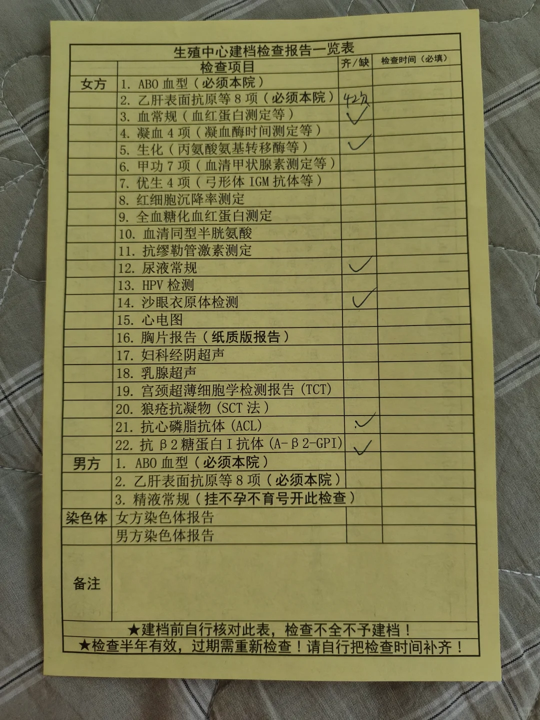 查单,半年内有的不需要重新开,然后去抽血需要空腹,抽完血去预约胸片(14点开始做,提前需要分诊,分诊越早做的越早,),心电图(预约时就把号取了,做的时候报道,按号做),超声(14点开始做,12:30开始分诊拿号,这个建议早点去分诊拿个靠前点的号,因为超声做的慢,其他两个做的都很快)。和老公的精子检查,我约在了两天后,然后就是等结果出来去建档。暂时就想到了这些,后面想道其他的再补充吧!#试管 #301医院