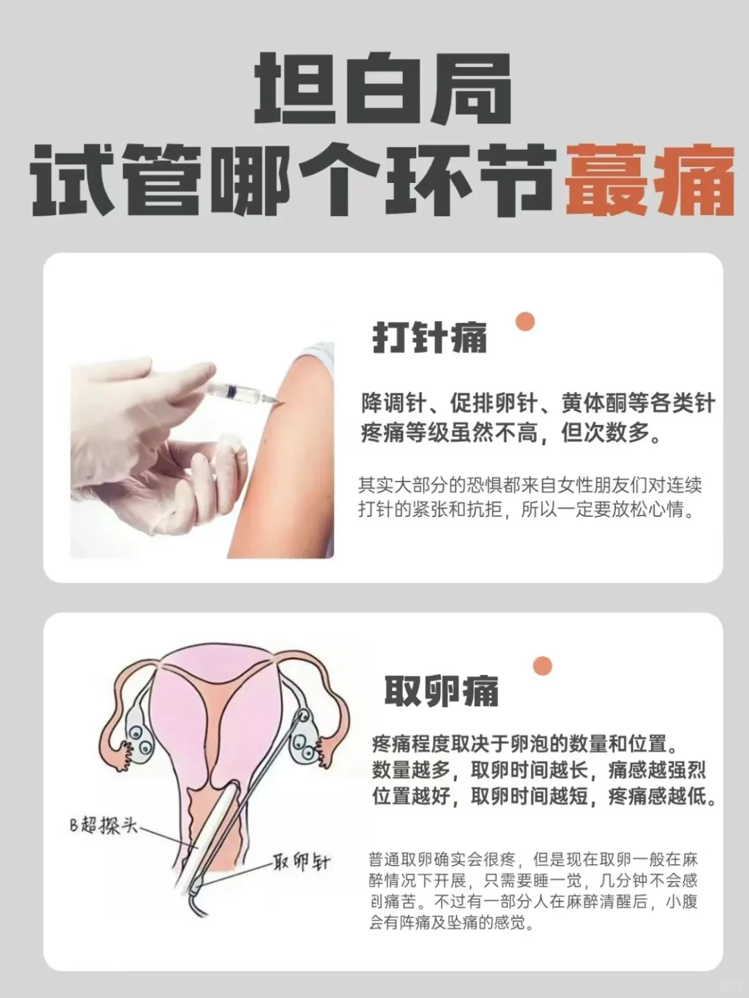 降调针、促排卵针、黄体酮等各类针,又分为皮下注射、肌肉注射等,疼痛等级虽然不高,但次数多。