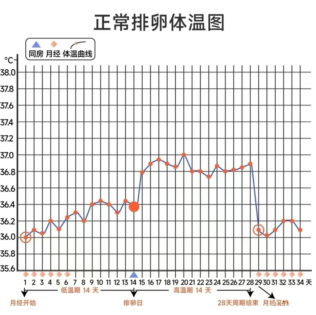 体温升高至 36.50以上,高温持续14天后下降,迎来下一次姨妈