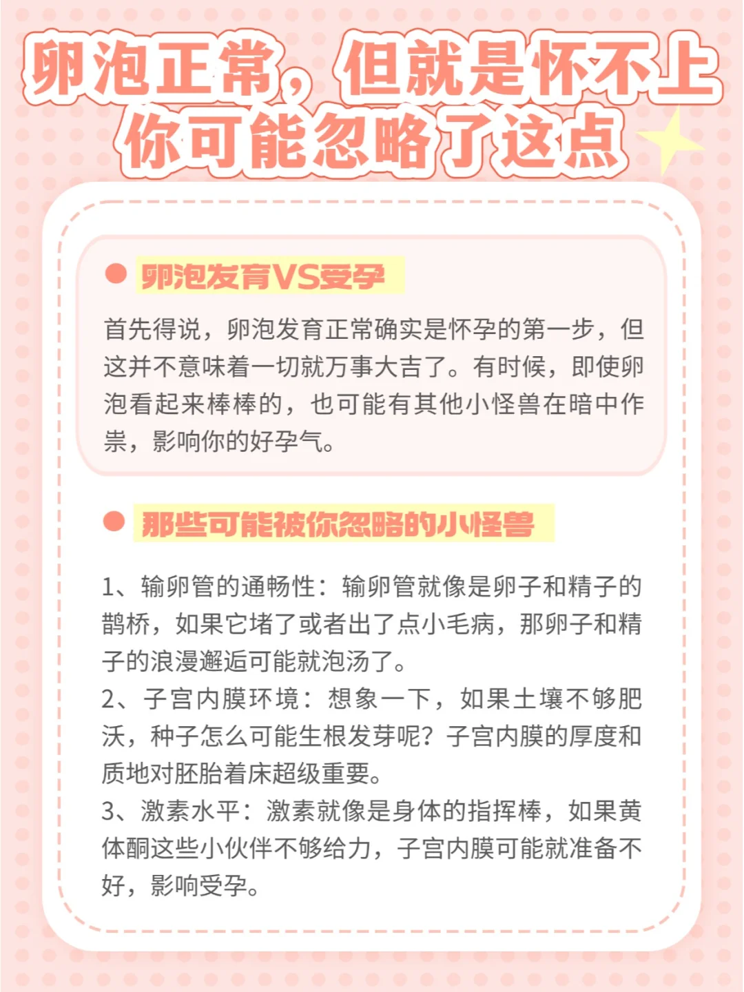 首先得说,卵泡发育正常确实是怀孕的第一步,但这并不意味着一切就万事大吉了。有时候,即使卵泡看起来棒棒的,也可能有其他小怪兽在暗中作祟,影响你的好孕气。